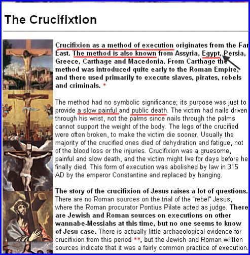if you look closely at the picture, it shows an ancient Egyptian crucified with his hands cut off at the palms :